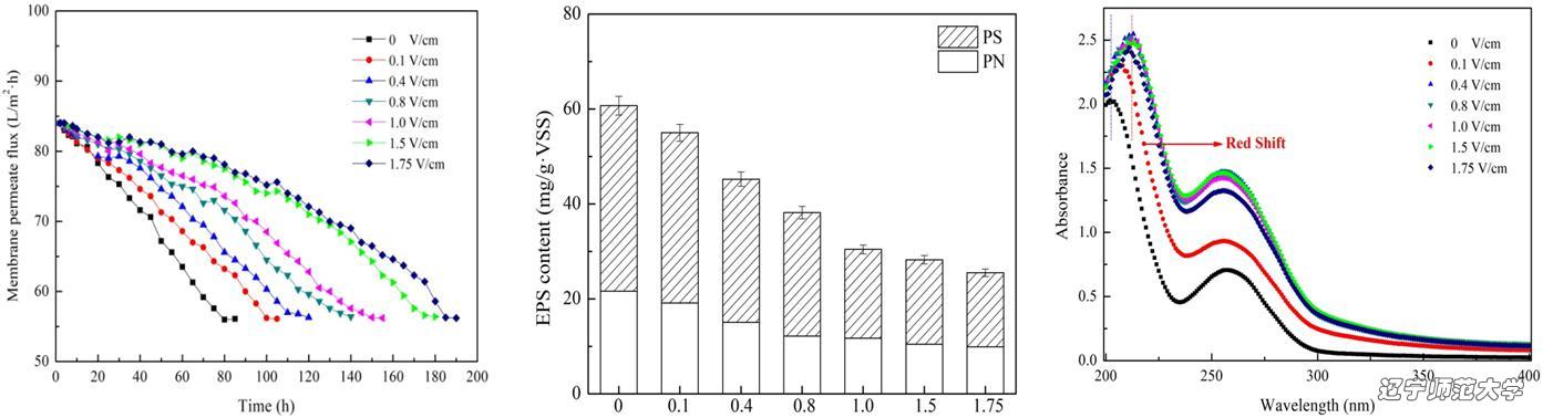 同时,与传统MBR相比,微电场强化MBR可有效减缓膜污染,推测其减缓膜污染的机理为1) 微电场对带负电荷的膜污染物(微生物絮体、EPS和SMP等主要膜污染物)产生静电排斥作用力,膜污染物在“电泳迁移力”的作用下具备远离阴极膜面的趋势;2) 阴极还原溶解氧产生H2O2,原位清除膜表面的污染物;3) 消减混合液中和膜面EPS含量,并改变EPS结构,增强其电负性。