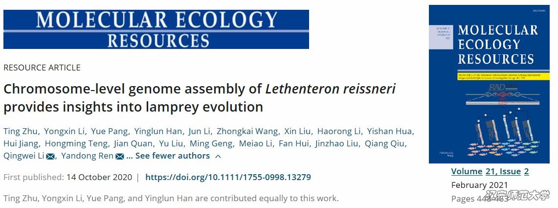 2020年10月14日,BEAT365官网七鳃鳗研究中心与西北工业大学生态与环境保护研究中心合作,在《Molecular Ecology Resources》在线发表了题为《Chromosome-level genome assembly ofLethenteron reissneriprovides insights into lamprey evolution》的研究成果。此项研究利用多种最新的高通量测序技术平台,成功组装了1.06 Gb的雷氏叉牙七鳃鳗基因组,并将所有scaffold锚定在了72条染色体上,获得了圆口纲第一个高精度的染色体级别的基因组图谱,为深刻揭示七鳃鳗独特的生物学特性和适应性进化特征提供了宝贵的遗传资源。