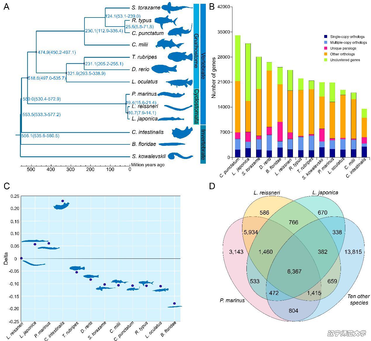 通过13个物种间的比较基因组学研究,我们推断雷氏叉牙七鳃鳗与日本七鳃鳗在10.7百万年前完成分化,而两者的共同祖先在19.4百万年前与海七鳃鳗完成分化;三种七鳃鳗均比其他脊椎动物表现出更快的进化速率。七鳃鳗特有的以及发生显著扩张/收缩的基因家族富集分析表明它们可能参与构建了七鳃鳗独特的生物学特性,为今后深入阐述圆口纲动物的原始性和特化性提供了丰富的素材。