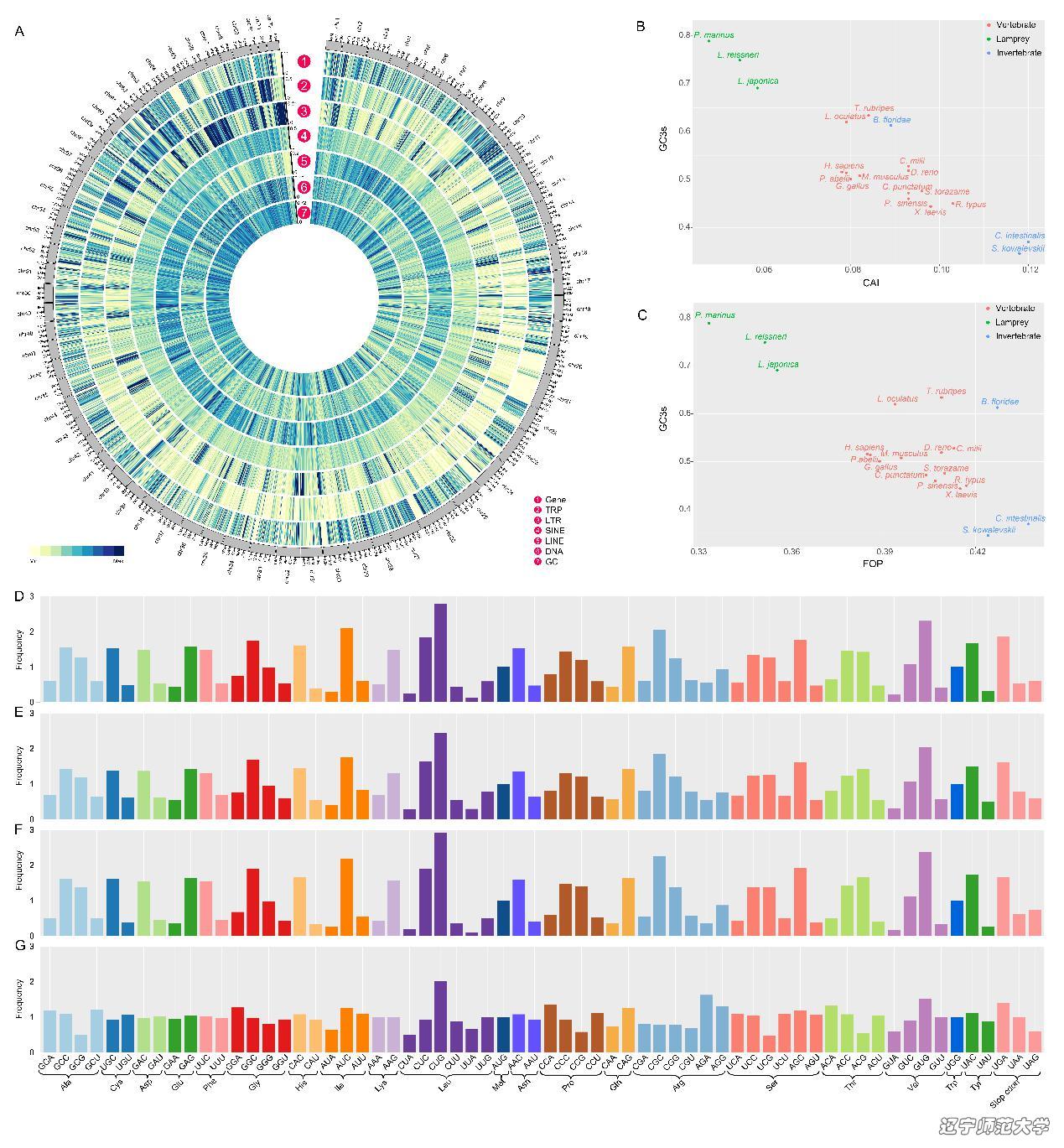 图1. 雷氏叉牙七鳃鳗基因组组装图谱与密码子使用特性分析