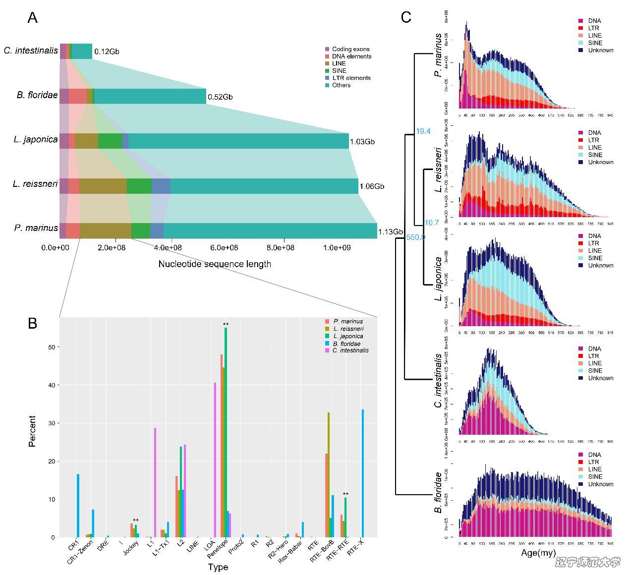 图2. 重复序列在七鳃鳗基因组内的爆发