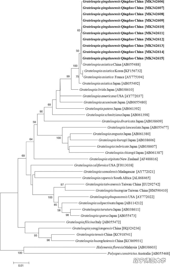蜈蚣藻属(Grateloupia C. Agardh ) 隶属于红藻门( Rhodophyta ) 海膜目(Halymeniales)海膜科(Halymeniaceae),是该目中最大的属,目前全世界共鉴定了有91 个种(Guiry & Guiry, 2013)。模式种为G. filicina (J. V. Lamouroux) C. Ag.,模式标本产地为意大利地中海,蜈蚣藻属海藻广泛分布于世界各地的暖温带、亚热带和热带沿海地区。蜈蚣藻属很多种具有很高的药用、食用以及工业用等经济价值,如:具有抗病毒、抗肿瘤、抗氧化、抗凝血及免疫调节等药理作用,常被用作驱蛔虫药;用作海藻沙拉和天然食用色素;其琼脂含量丰富,亦可作为制作琼胶的原料,其在市场上的需求量也日益增多,因此,对其的开发利用就显得尤为关键,而这些都基于对蜈蚣藻属海藻的准确鉴定和分类。