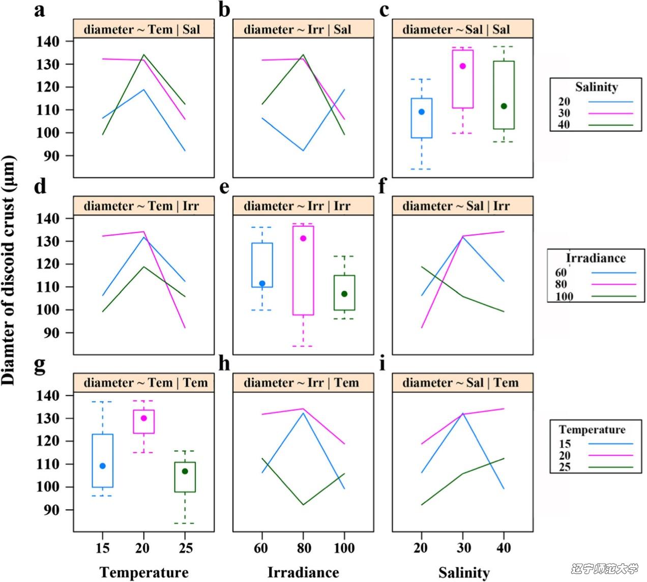 温度、光照强度和光周期三因素正交实验结果表明,三因素独立变化对青岛蜈蚣藻的早期发育存在显著影响;温度和光照强度的交互作用对青岛蜈蚣藻的盘状体发育时期存在显著影响。