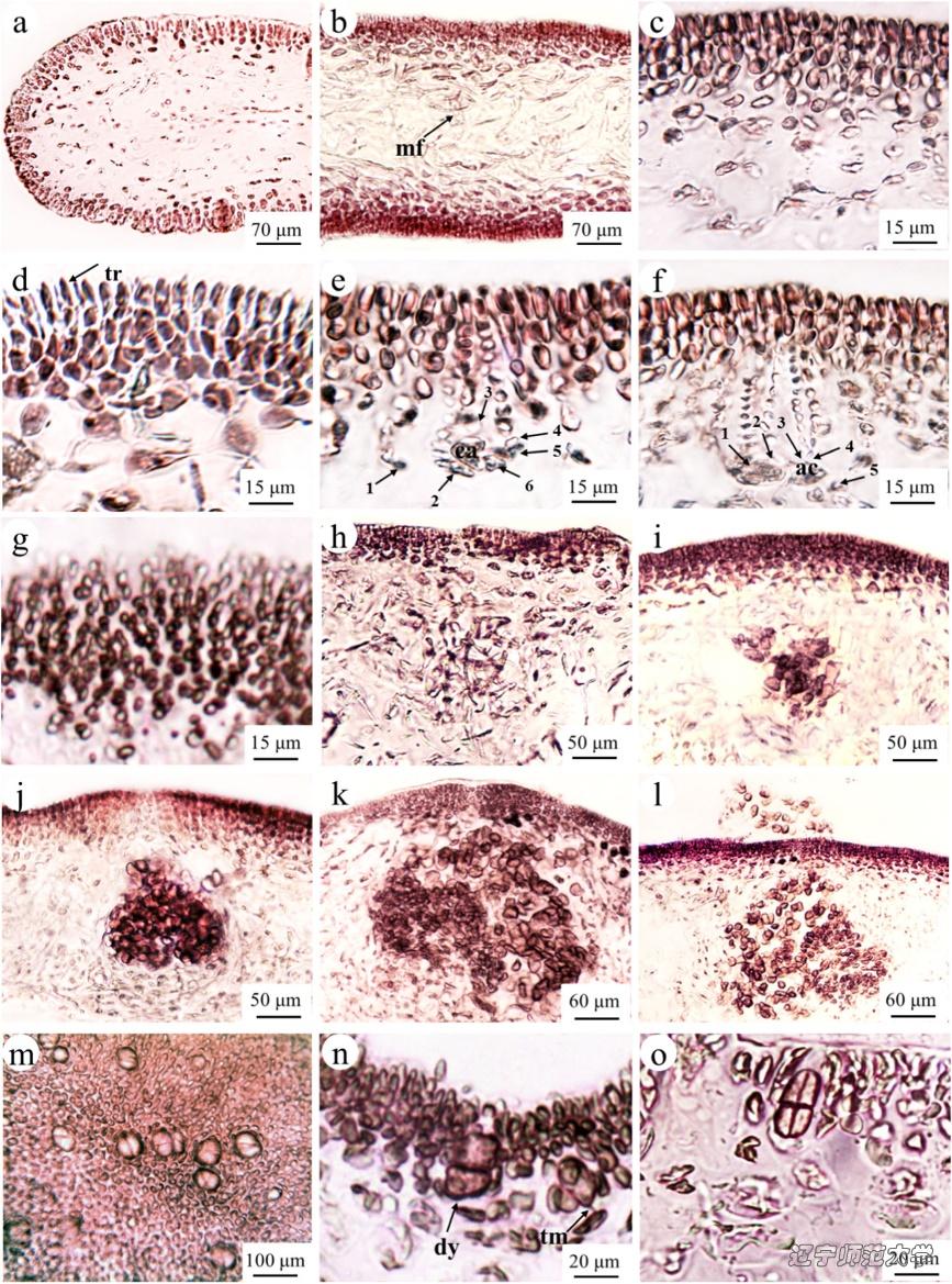 2020年3月5日,BEAT365官网王宏伟教授课题组基于形态观察、发育、生态习性和分子分析研究将青岛蜈蚣藻(Grateloupia qingdaoensis Li et Ding)进行重新鉴定。结构研究表明,青岛蜈蚣藻的果胞枝生殖枝丛和辅助枝生殖枝丛属于典型的Grateloupia 型(6cpb-5auxb type)。孢子早期发育过程属于“间接盘状体型”。青岛蜈蚣藻的生活史过程存在世代交替现象,并且为典型的“同形世代交替”。