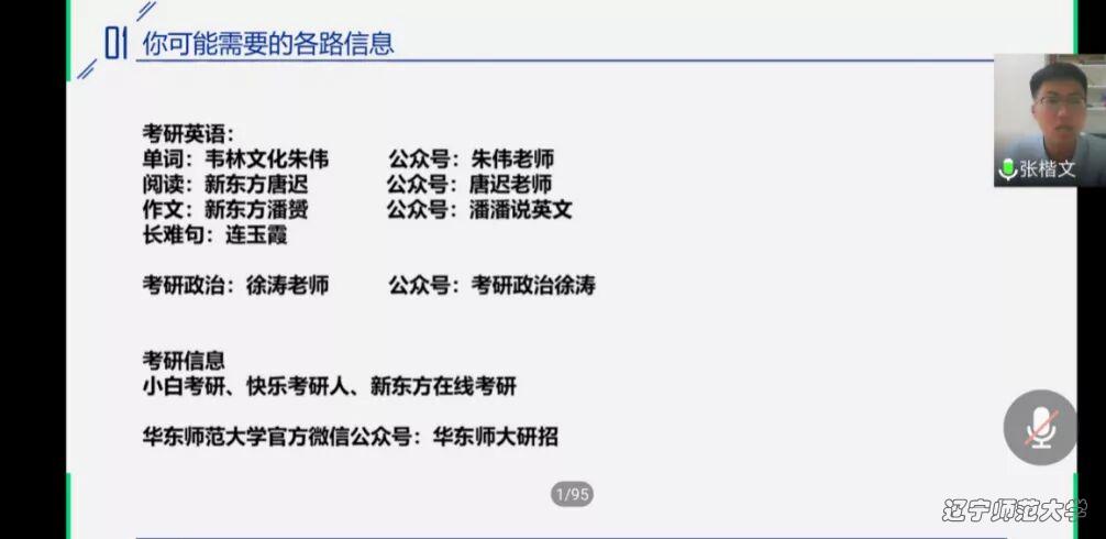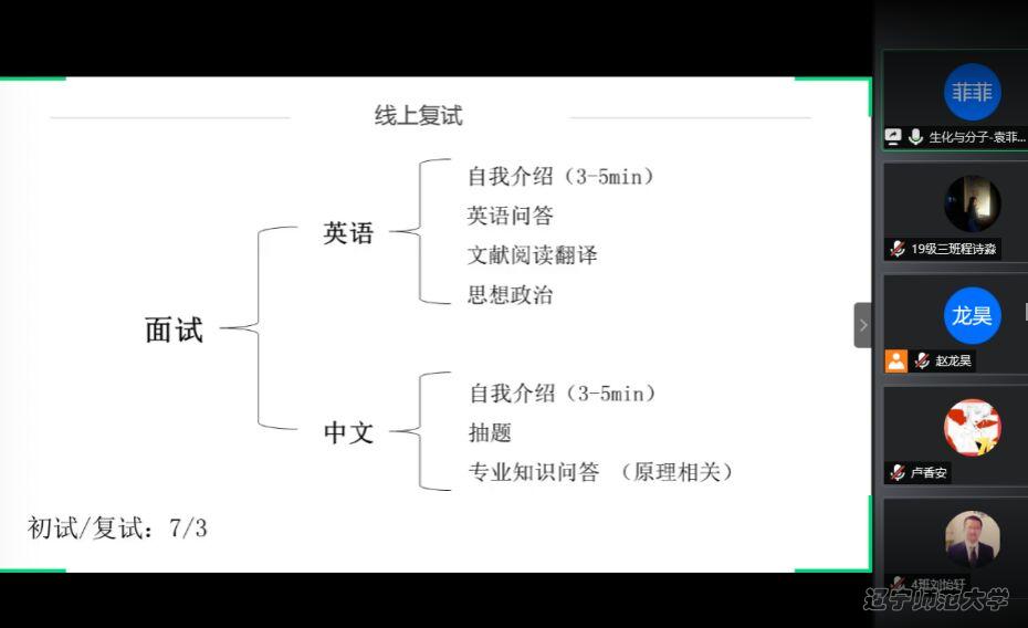 王晓凤从基本情况、专业课、公开课和复试四个方面进行了2020华师植物学考研经验分享。首先,她以自身考研的经历,建议大家在初试上多下功夫,以求复试更加稳定。接下来,她向同学们介绍了在考研中所用到的专业课的书、真题,并建议同学们多读多看,不要抱有侥幸心理。随后,她讲述了往年的复试流程及重点,并着重强调初试内容在复试中的重要性。最后她叮嘱同学们要坚持学习,不要有太多压力,只要每天保持好学习状态,最后的结果都将是可观的。