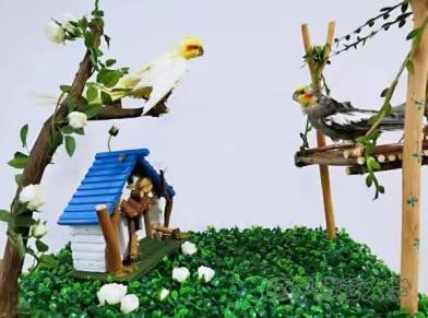 作品是两只玄凤鹦鹉,黄色的玄风站在房子顶上,灰色的玄风站在秋千上,它们在清晨以相似的形态互相对望,互相打招呼,以此来体现出鹦鹉的效鸣行为。这件作品,更多的是想要和大家科普这种效鸣行为,呼吁大家以更科学的方式喜爱鸟类、爱护鸟类,一起创建和平友爱的美好家园。