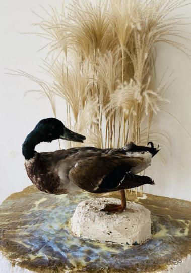 绿头鸭,鸭科鸭属动物。作品采用单只绿头鸭单脚站立于水面石头上睡眠的造型。作品寓意为:长达半年的疫情使我们国家和人民的生产和生活都受到了严重的影响,经过艰苦卓绝的努力,付出了巨大的代价,中国有力扭转了国内疫情局势,维护了人民生命安全和身体健康。虽然现在疫情已经得到缓解,但是我们仍要时刻保持警惕,警钟长鸣。