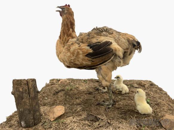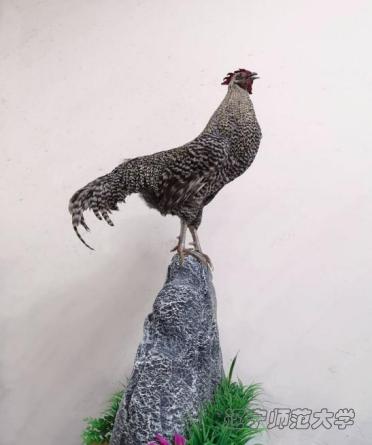 作品中的动物是芦花鸡,芦花鸡是雉魂科原鸡属动物。体型一致,颈部挺立,稍显高昂,前躯稍窄,背长而平直,后躯宽而丰满,腿较长,尾羽高翘,体型成元宝状。全身大部分羽毛成黑白相间,宽窄一致的斑纹状。其抗病能力强,体态健美,肌肉发达。本作品中的标本由宰杀,脱皮去肉,填充整形等过程制作完成。展现了芦花鸡傲立山巅,日出啼鸣的场景。