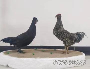 本标本选用我国本土经济鸡种:芦花鸡和五黑鸡。标本造型采取自然界中常见的两雄性公鸡相互争斗,抢夺交配权后一方胜利、一方战败的姿态,展现了雄鸡斗胜后高昂的气势。魁既表现了胜方魁梧的姿态,也意味着胜后获得魁首。
