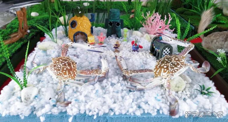 作品以动画片《海绵宝宝》中的“蟹堡王”为主题,利用螃蟹为动物标本创造了一个如梦如幻的海底世界,标本作品主要以两只兰花蟹为主体,与作品名称“蟹堡王”相对应,并且蟹身带有蓝色花纹,蟹腿也有大片蓝色覆盖,更加贴合海洋主题,从旁添加了海绵宝宝、派大星、蟹老板等动画角色和其建筑,使我们的作品更加丰富多彩,在梦幻中添加活泼生动元素,也使整个作品基调更加协调。